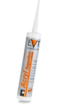 EVT Acryl Regenfest ist eine regenfeste Acryldichtmasse speziell für den Außenbereich. Es kommt hier bei Wasserkontakt zu keinen Auswaschungen von Füllstoffen.