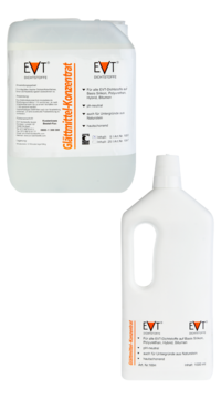 Das Glättmittelkonzentrat im Mischungsverhältnis 1:10 verdünnen. Je nach Arbeitsweise kann bis zu einem Verhältnis von 1:100 verdünnt werden. Überschüssiges Glättmittel nach der Verarbeitung entfernen, um eine eventuelle Fleckenbildung zu vermeiden.
